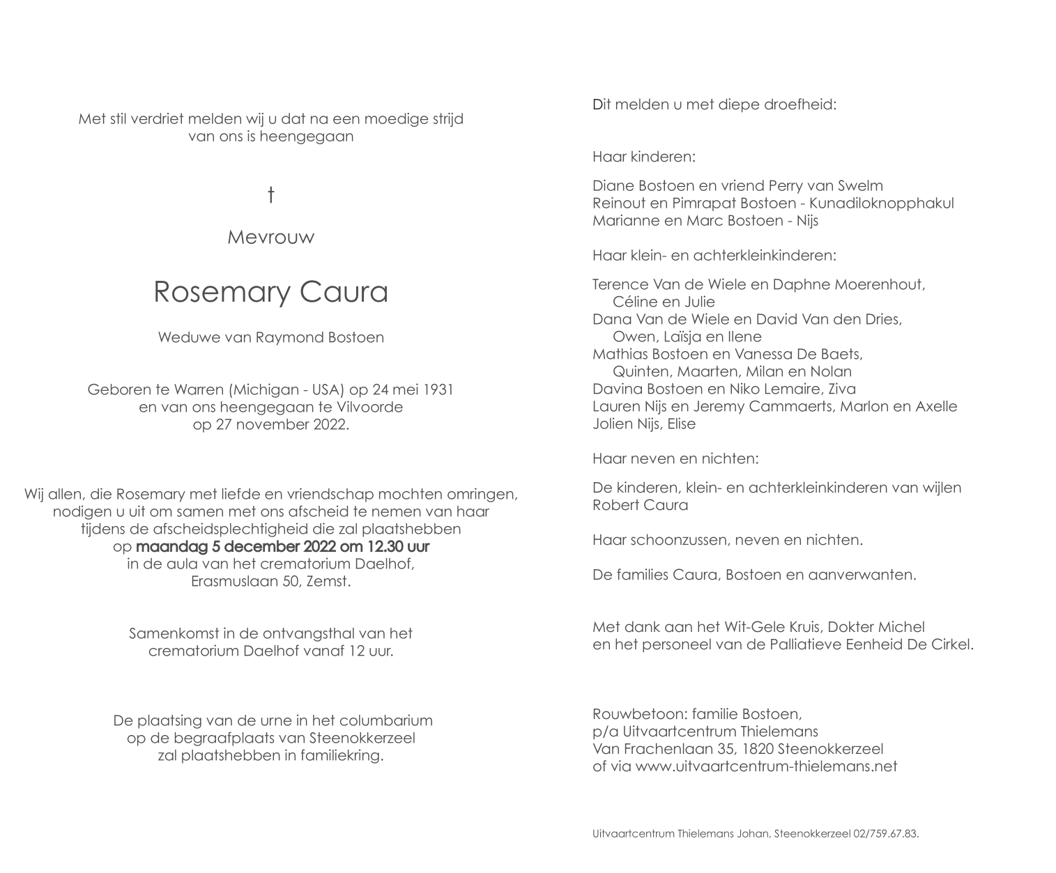 Overleden te Vilvoorde (1800) op zondag 27 november 2022 op 91-jarige leeftijd