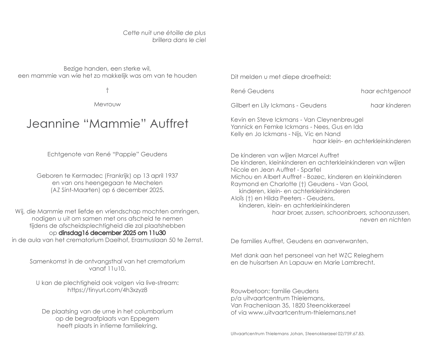 Overleden te Mechelen (2800) op zaterdag 6 december 2025 op 88-jarige leeftijd