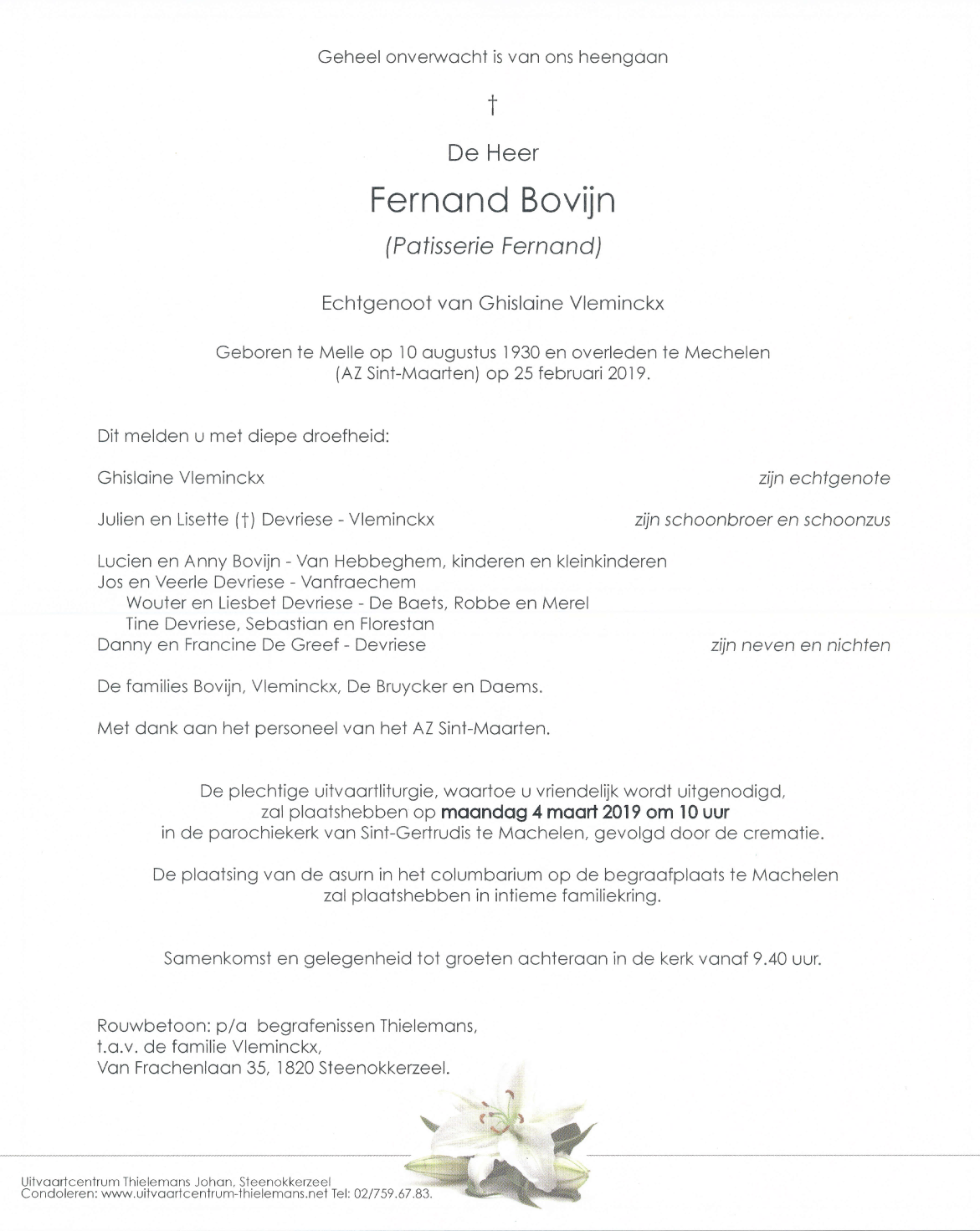 Overleden te Mechelen (2800) op maandag 25 februari 2019 op 88-jarige leeftijd