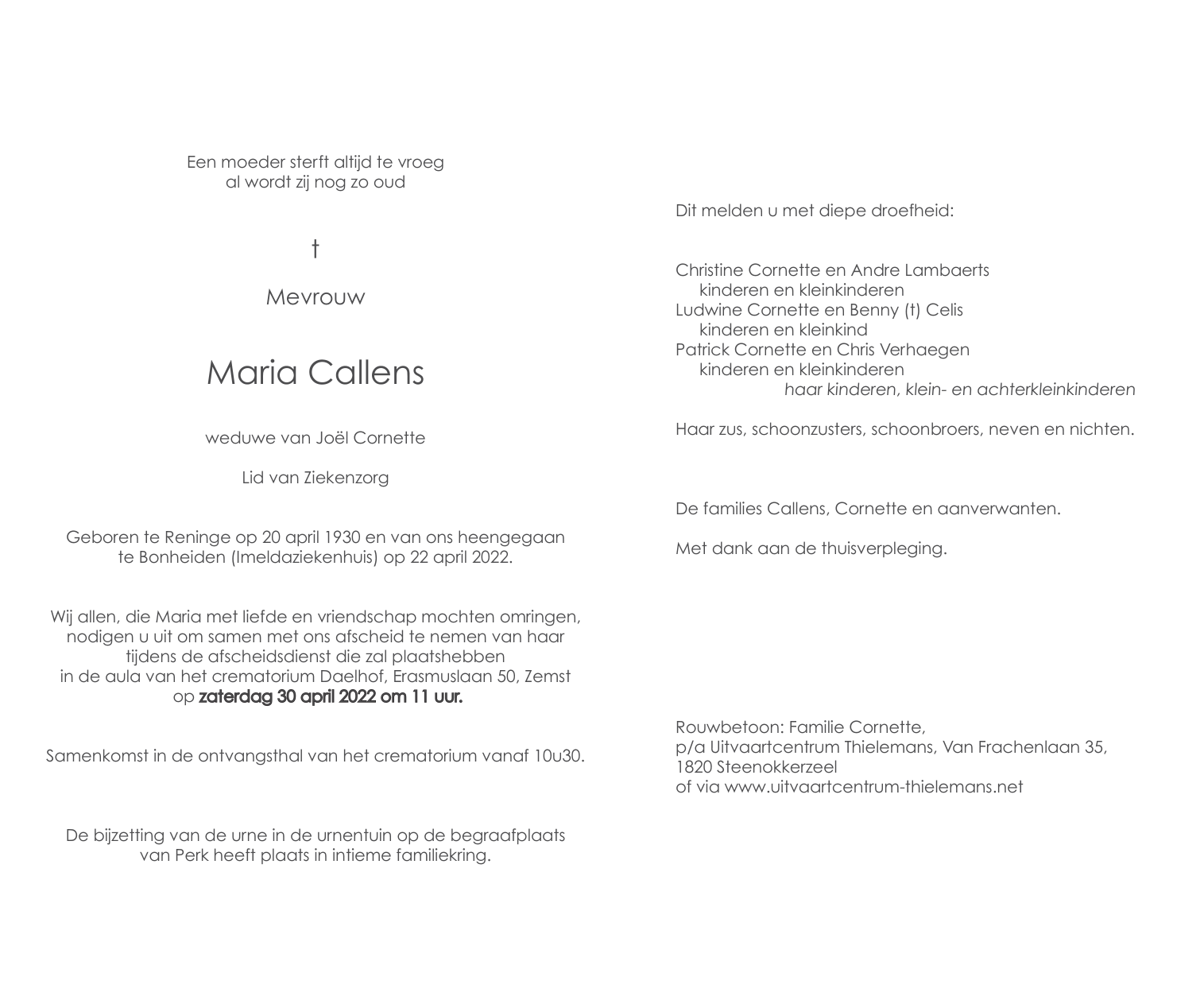 Overleden te Bonheiden (2820) op vrijdag 22 april 2022 op 92-jarige leeftijd