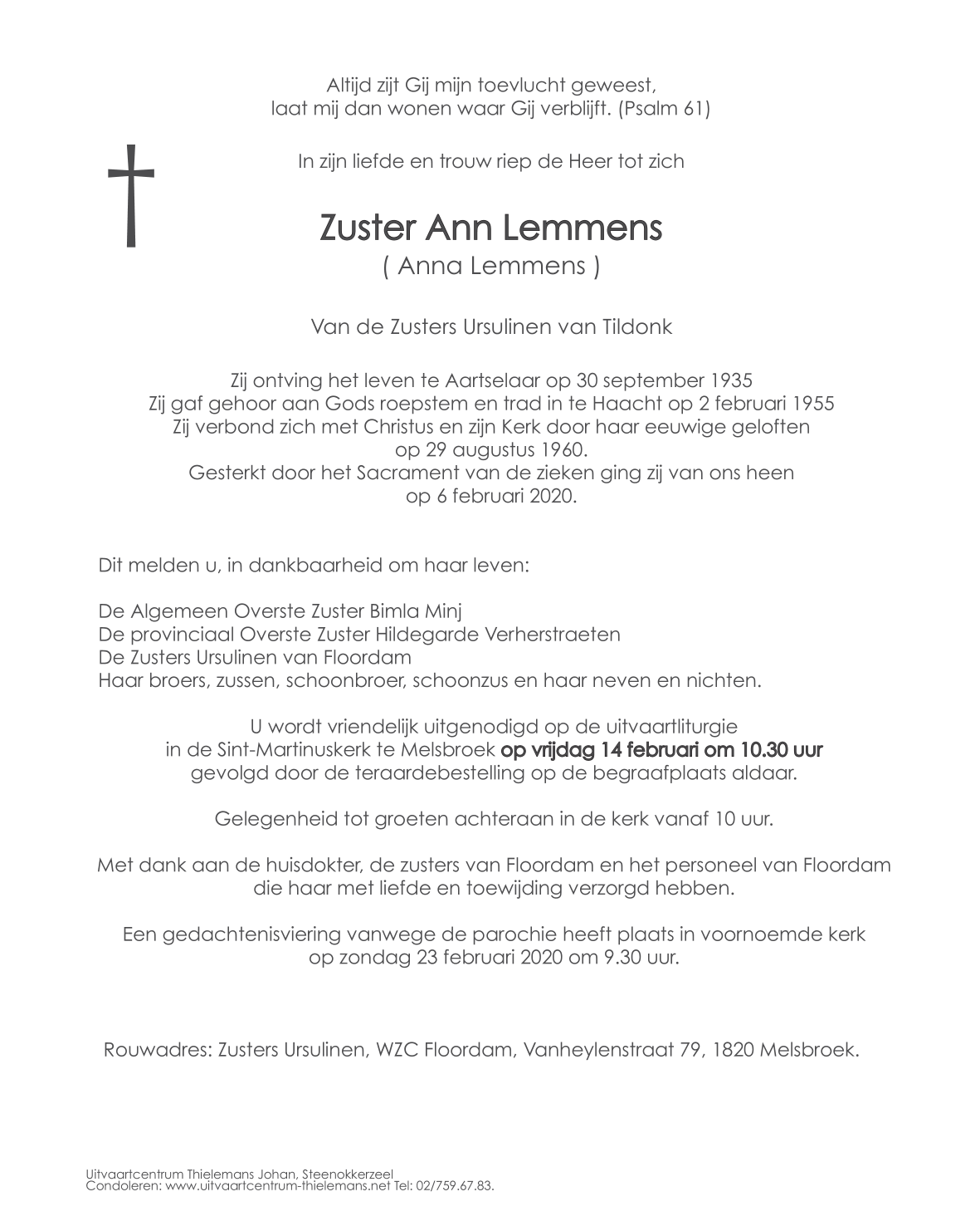 Overleden te Melsbroek (1820) op donderdag 6 februari 2020 op 84-jarige leeftijd
