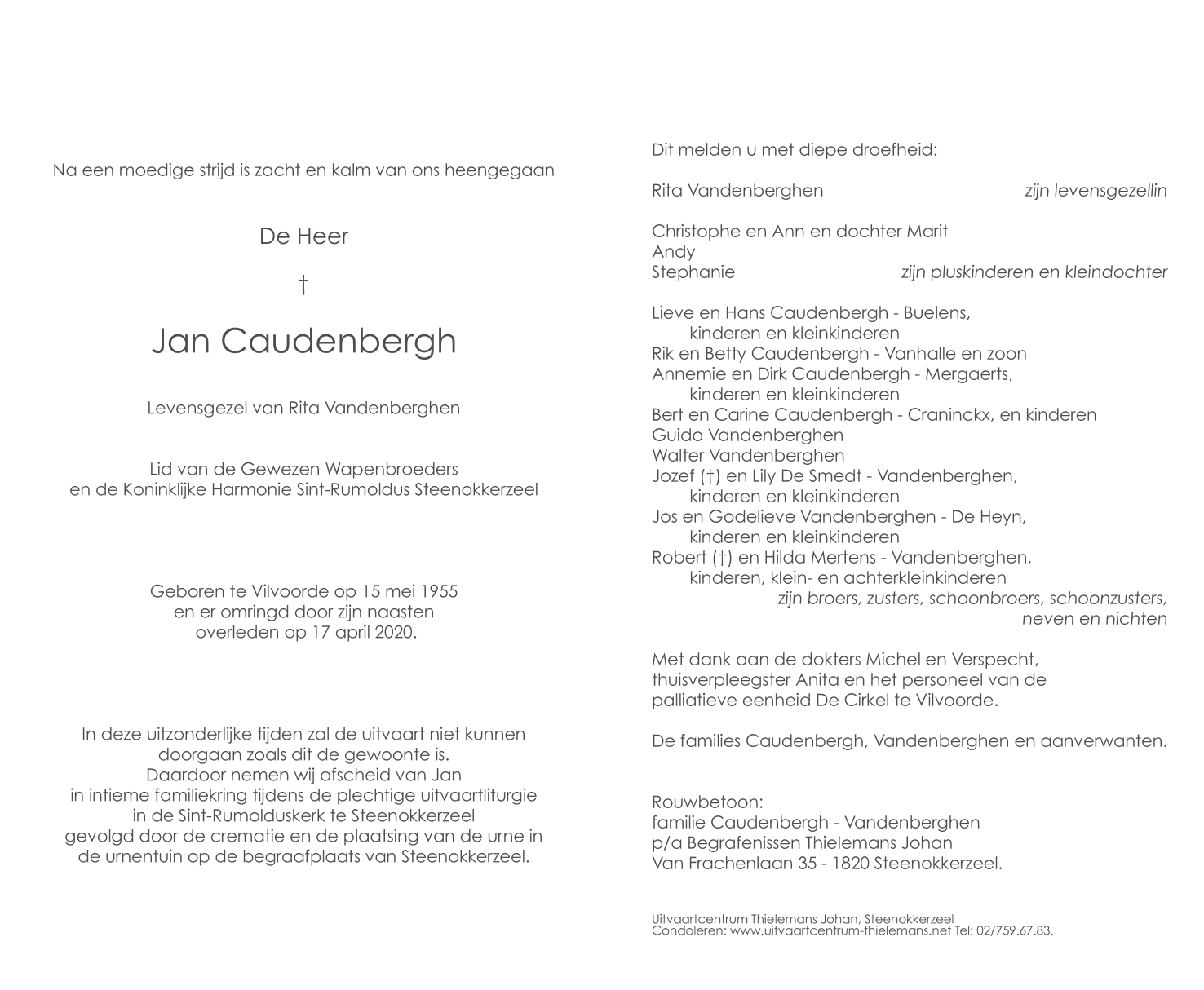 Overleden te Vilvoorde (1800) op vrijdag 17 april 2020 op 64-jarige leeftijd