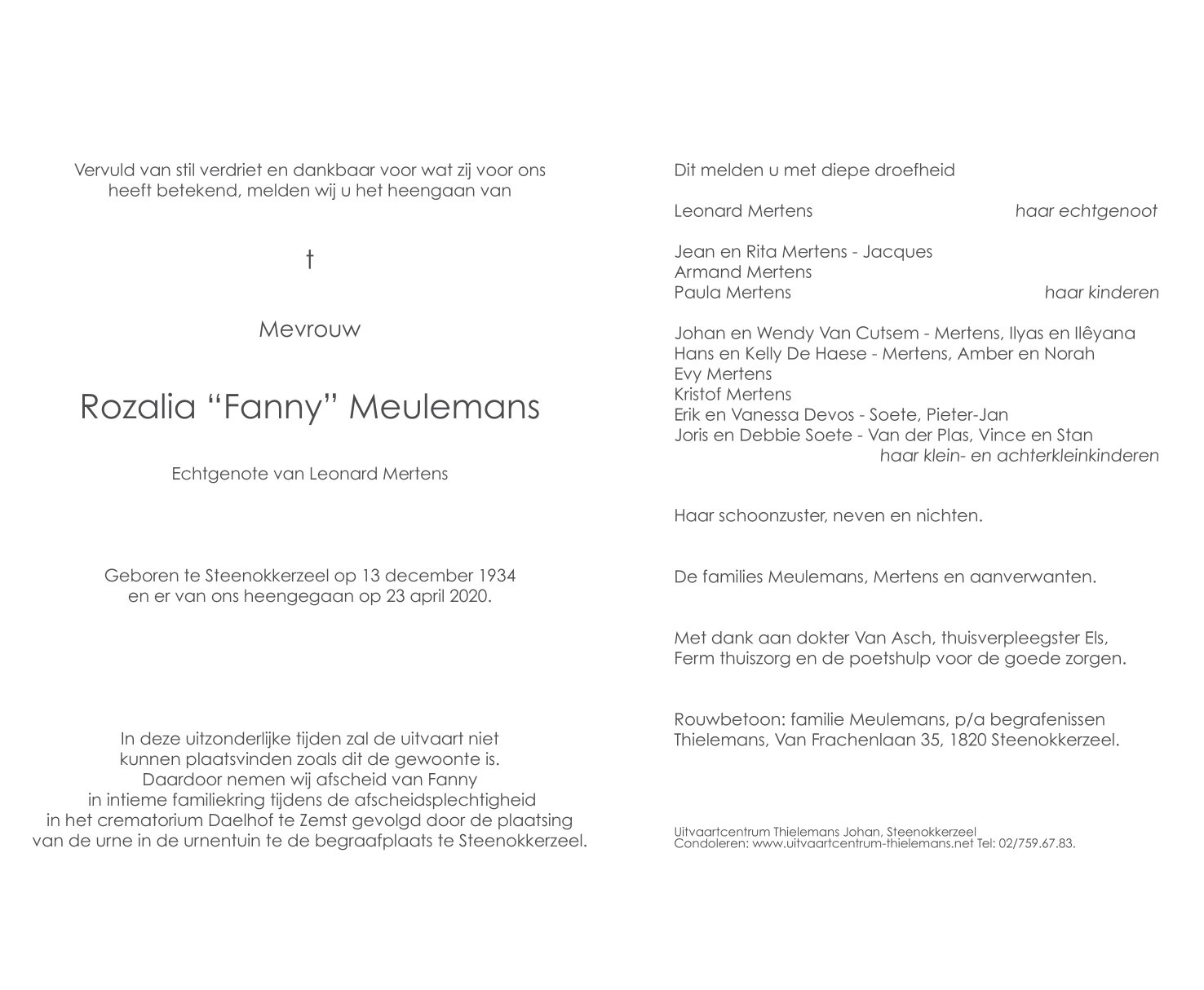 Overleden te Steenokkerzeel (1820) op donderdag 23 april 2020 op 85-jarige leeftijd