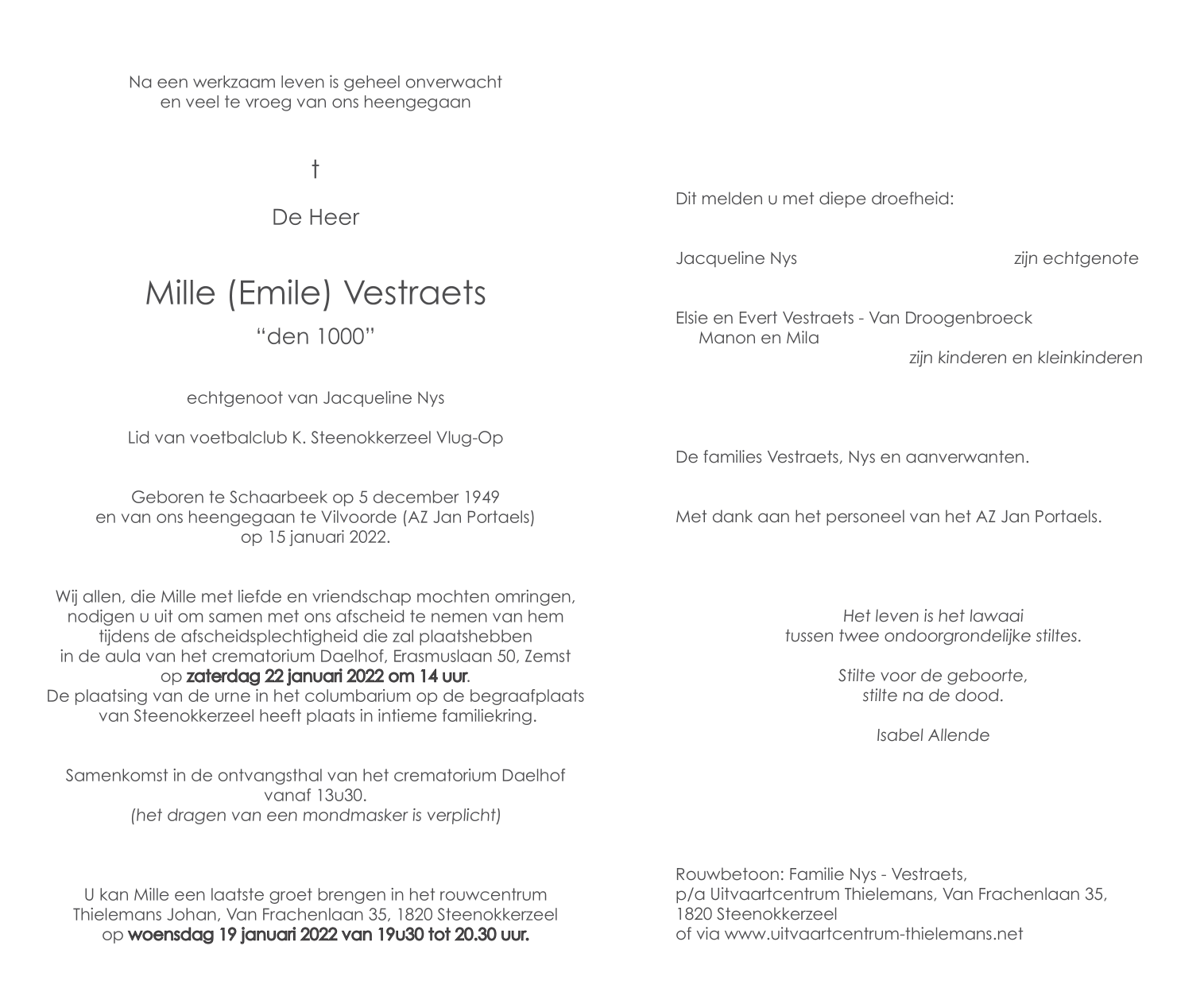 Overleden te Vilvoorde (1800) op zaterdag 15 januari 2022 op 72-jarige leeftijd
