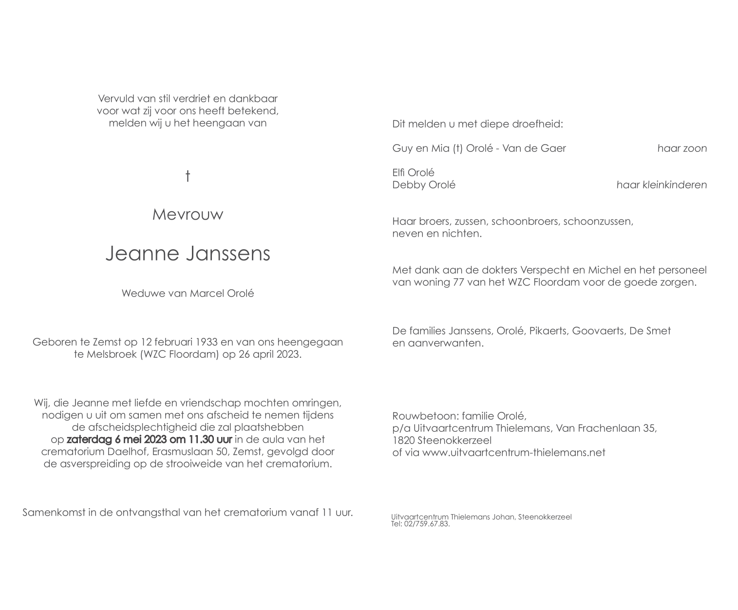 Overleden te Melsbroek (1820) op woensdag 26 april 2023 op 89-jarige leeftijd